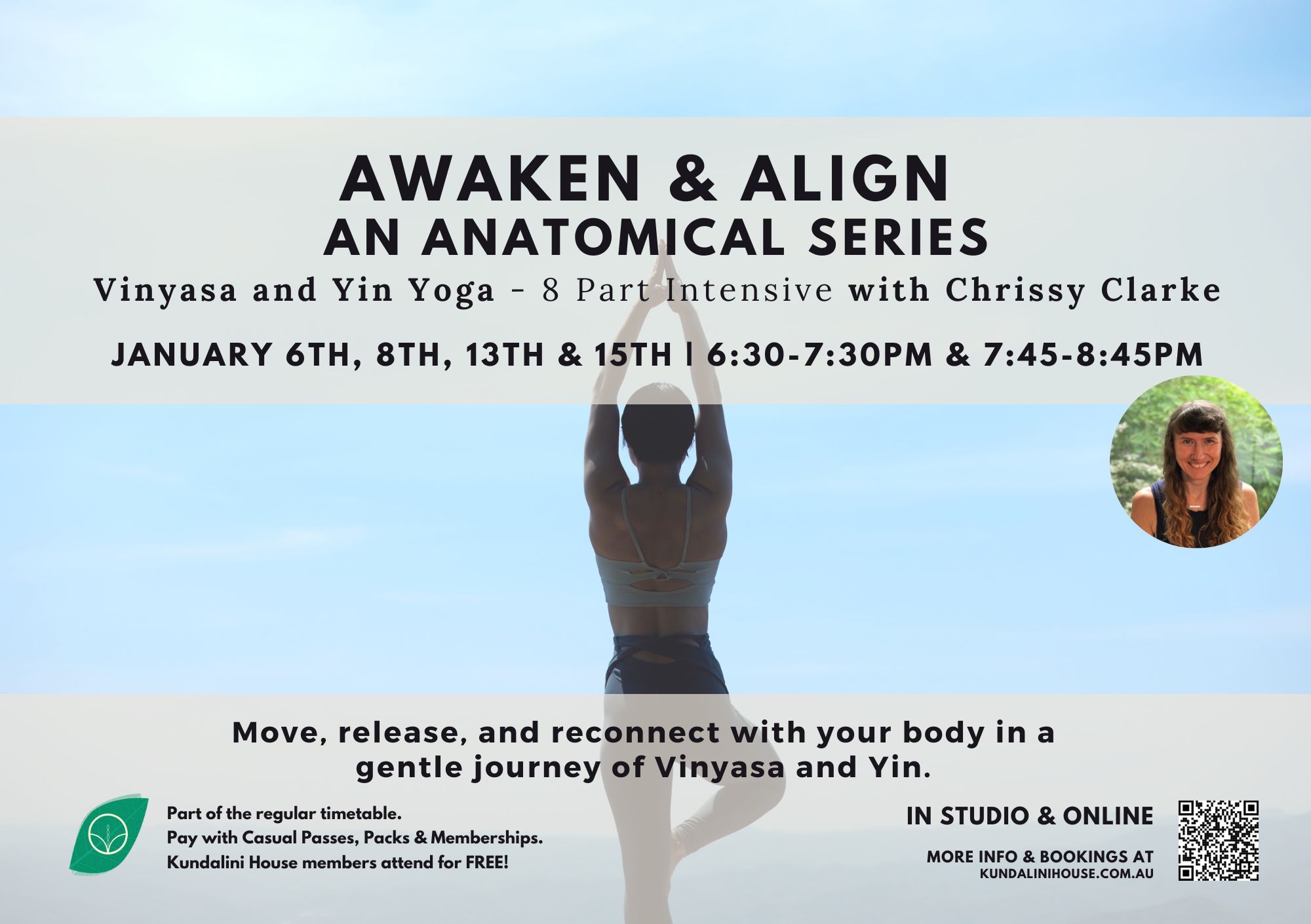 Awaken & Align: A Two-Week Vinyasa + Yin Anatomical Series Teacher: Chrissy SunshineDates: Tues 6th – Thurs 15th January 2026Times: 6:30–7:30pm (Vinyasa) + 7:45–8:45pm (Yin)Location: Kundalini House Studio + Online _____________________________________________________________________________________________________________________________________ Event Description Awaken & Align is a two-week, four-part anatomical journey designed to bring strength, mobility, and ease to the body through paired Vinyasa [...]