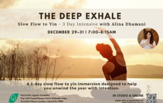 The Deep Exhale: Slow Flow to Yin 3 Day Intensive Teacher: Alina Dhamani Dates: Mon, December 29 - Wed, December 31,2025Time: 7:00am - 8:15am Location: Kundalini House Studio + Online Event Description A 3-day slow-flow-to-yin immersion designed to help you unwind the year with purpose and presence. Across these three sessions, you’ll be guided through mindful movement, [...]