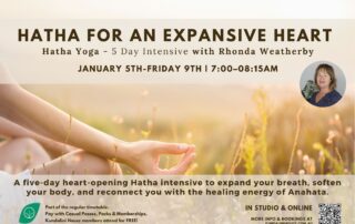 Hatha for an Expansive Heart - 5 Day Hatha Yoga Intensive Teacher: Rhonda Weatherby Dates: Mon, January 5th - Fri, January 9, 2026Time: 7:00am - 8:15am Location: Kundalini House Studio + Online Event Description Step into a luscious five-day Hatha yoga intensive designed to open the heart—physically, emotionally, and energetically. This week offers a gentle yet powerful [...]