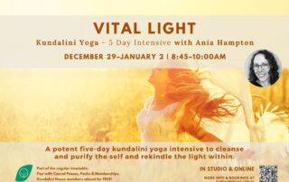 Vital Light - 5 Day Kundalini Yoga Intensive Teacher: Ania Thompson Dates: Mon, December 29, 2025 - Fri, January 02, 2026Time: 8:45am - 10:00am Location: Kundalini House Studio + Online Event Description A potent five-day Kundalini Yoga intensive designed to cleanse, purify, and reignite the inner light. As one-year closes and another begins, this immersion offers a [...]